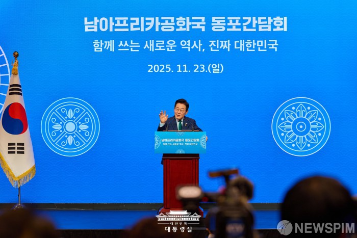 [서울=뉴스핌] 이재명 대통령이 지난 23일(현지시간) 남아프리카공화국 요하네스버그 샌튼 컨벤션센터에서 열린 동포간담회에서 인사말을 하고 있다. [사진=대통령실] 2025.11.25 photo@newspim.com