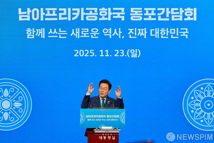 [서울=뉴스핌] 이재명 대통령이 지난 23일(현지시간) 남아프리카공화국 요하네스버그 샌튼 컨벤션센터에서 열린 동포간담회에서 인사말을 하고 있다. [사진=대통령실] 2025.11.25 photo@newspim.com