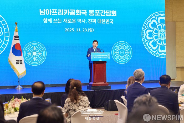 [서울=뉴스핌] 이재명 대통령이 지난 23일(현지시간) 남아프리카공화국 요하네스버그 샌튼 컨벤션센터에서 열린 동포간담회에서 인사말을 하고 있다. [사진=대통령실] 2025.11.25 photo@newspim.com