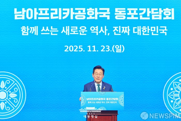 [서울=뉴스핌] 이재명 대통령이 지난 23일(현지시간) 남아프리카공화국 요하네스버그 샌튼 컨벤션센터에서 열린 동포간담회에서 인사말을 하고 있다. [사진=대통령실] 2025.11.25 photo@newspim.com