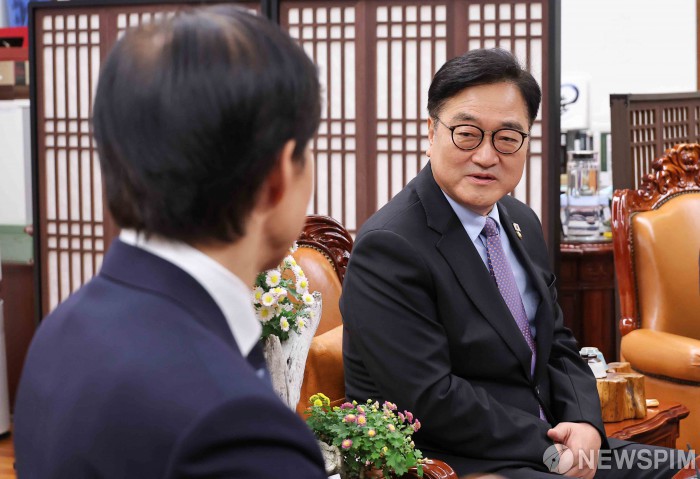 [서울=뉴스핌] 윤창빈 기자 = 우원식 국회의장이 25일 서울 여의도 국회에서 당대표 취임 인사 차 예방한 조국 조국혁신당 대표와 대화를 나누고 있다.2025.11.25 pangbin@newspim.com