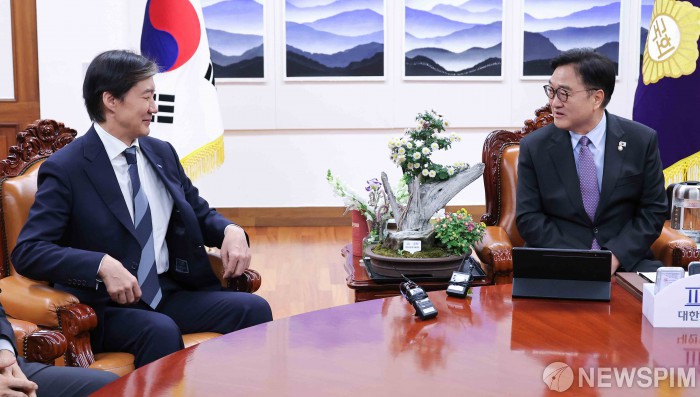 [서울=뉴스핌] 윤창빈 기자 = 우원식 국회의장이 25일 서울 여의도 국회에서 당대표 취임 인사 차 예방한 조국 조국혁신당 대표와 대화를 나누고 있다.2025.11.25 pangbin@newspim.com