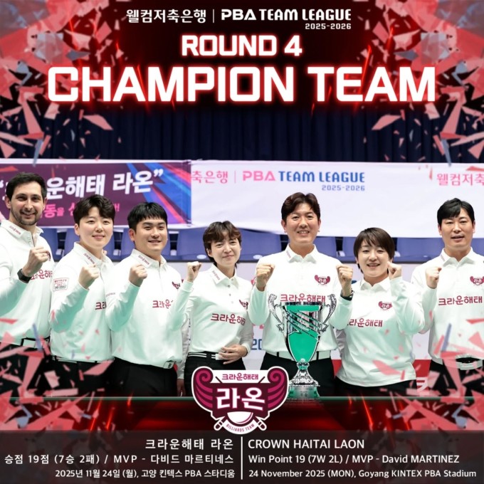 크라운해태는 24일 고양 킨텍스 PBA스타디움에서 열린 웰컴저축은행 PBA 팀리그 4라운드 마지막 날 휴온스에 3-4로 졌지만, SK렌터카 역시 하이원리조트에 덜미를 잡히면서 7승 2패, 승점 19로 우승을 확정했다. 2023-2024시즌 이후 약 2년 만의 정상 복귀다. 이로써 크라운해태는 하나카드, 웰컴저축은행, SK렌터카에 이어 포스트시즌 진출권을 확보한 네 번째 팀이 됐다.