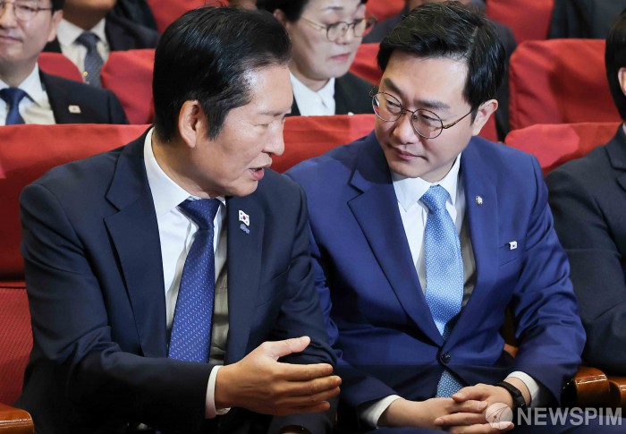 [서울=뉴스핌] 윤창빈 기자 = 정청래 더불어민주당 대표, 장경태 서울시당 위원장이 25일 서울 여의도 국회 의원회관에서 열린 민주당 서울시당 ‘천만의 꿈 경청단’ 출범식에서 대화를 나누고 있다. 2025.11.25 pangbin@newspim.com