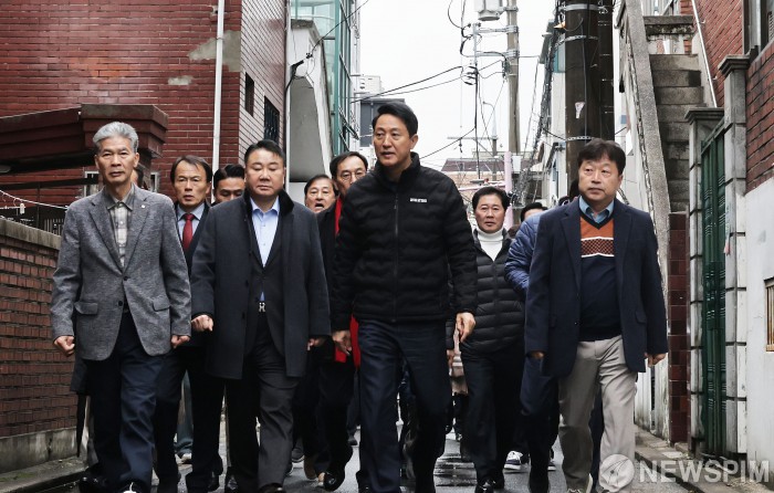 [서울=뉴스핌] 양윤모 기자 = 오세훈 서울시장이 25일 오전 서울 중랑구 중화동 329-38번지 일대 중화동 모아타운 현장 방문행사를 하고 있다. 중랑구 중화동 일대 모아타운은 4개 사업지에서 총 2295가구(임대 453가구)가 공급되며 사업지는 세입자가 이사할 때 이주비 등을 지원하고 용적률을 추가로 확보하는 '세입자 손실보상' 제도가 적용된다. 2025.11.25 yym58@newspim.com