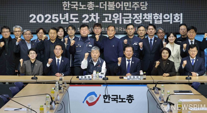 [서울=뉴스핌] 윤창빈 기자 = 정청래 더불어민주당 대표, 김동명 한국노총 위원장 및 참석자들이 25일 서울 여의도 한국노총 대회의실에서 열린 한국노총-더불어민주당 2025년도 제2차 고위급정책협의회에서 기념촬영을 하고 있다. 2025.11.25 pangbin@newspim.com