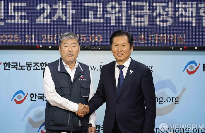 [서울=뉴스핌] 윤창빈 기자 = 정청래 더불어민주당 대표, 김동명 한국노총 위원장이 25일 서울 여의도 한국노총 대회의실에서 열린 한국노총-더불어민주당 2025년도 제2차 고위급정책협의회에서 기념촬영을 하고 있다. 2025.11.25 pangbin@newspim.com
