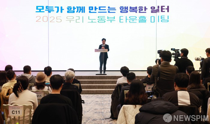 [서울=뉴스핌] 김학선 기자 = 김영훈 고용노동부 장관이 25일 서울 마포구 중소기업DMC타워 컨벤션홀에서 열린 '2025 우리 노동부 타운홀 미팅'에서 인사말을 하고 있다. 이번 타운홀 미팅은 릴레이 현장 방문의 마지막 일정으로 제조·IT·택배·웹툰·돌봄 등 다양한 분야의 노동자 150여명이 참석해 현장에서 겪는 문제를 공유했다. 2025.11.25 yooksa@newspim.com