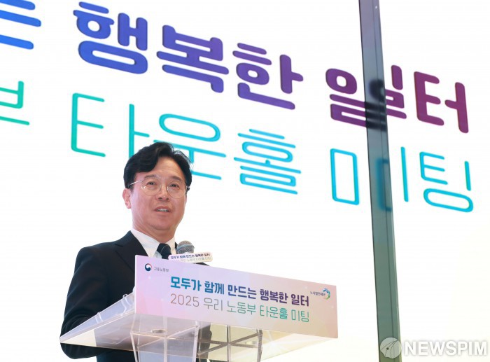 [서울=뉴스핌] 김학선 기자 = 김영훈 고용노동부 장관이 25일 서울 마포구 중소기업DMC타워 컨벤션홀에서 열린 '2025 우리 노동부 타운홀 미팅'에서 인사말을 하고 있다. 이번 타운홀 미팅은 릴레이 현장 방문의 마지막 일정으로 제조·IT·택배·웹툰·돌봄 등 다양한 분야의 노동자 150여명이 참석해 현장에서 겪는 문제를 공유했다. 2025.11.25 yooksa@newspim.com