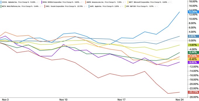 24일까지 11월 시세 변동률, (위에서 아래로) 알파벳·애플·S&P500·메타·아마존·마이크로소프트·엔비디아·오라클 [자료=코이핀]
