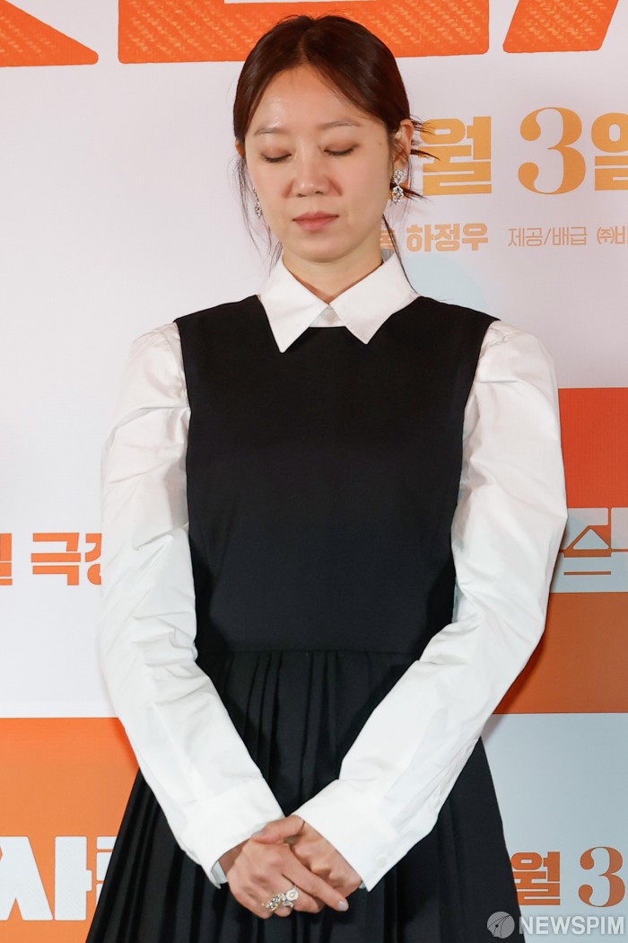 [서울=뉴스핌] 류기찬 기자 = 국민배우 이순재가 세상을 떠난 가운데 배우 공효진이 25일 오후 서울 강남구 메가박스 코엑스에서 열린 영화 ‘윗집사람들’ 기자 간담회에 앞서 고인을 애도하는 묵념을 하고 있다. ‘윗집사람들’은 매일 밤 '섹다른' 층간소음으로 인해 윗집 부부(하정우, 이하늬)와 아랫집 부부(공효진, 김동욱)가 함께 하룻밤 식사를 하게 되면서 벌어지는 예측불허 이야기를 담은 작품이다. 오는 12월 3일 개봉. 2025.11.25 ryuchan0925@newspim.com