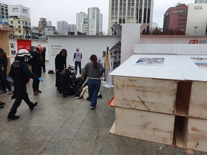 | 25일 낮 12시54분께 부산 동구 초량동 부산역 앞 광장 구조물 전도되어 보행자 1명이 다쳐 인근 병원으로 옮겨져 치료를 받았다. [사진=부산소방재난본부] 2025.11.25 |