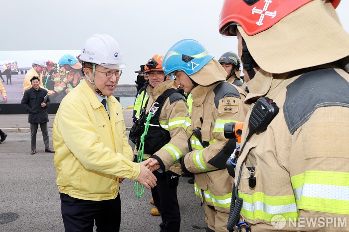 [서울=뉴스핌] = 윤호중 행정안전부 장관이 25일 오후 29개 관계기관 합동으로 인천항 인근 해상에서 열린 '레디 코리아(READY Korea) 4차 훈련' 해상 선박 충돌사고 대응체계 훈련을 참관한 뒤 관계자들을 격려하고 있다. [사진=행정안전부] 2025.11.25 photo@newspim.com