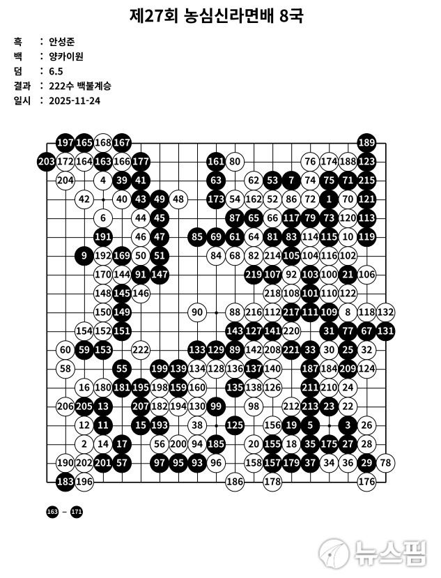 초반에는 팽팽한 접전이 이어졌지만, 하변 백 세력에 침투한 흑(양카이원 9단)이 타개 과정에서 벌어진 패싸움에서 큰 손실을 입으며 형세가 급격히 기울었다. 이후 좌상귀에서 백 대마를 겨냥한 반전 시도도 있었지만, 이야마 유타 9단이 정교한 수읽기와 정확한 응수로 격차를 벌리며 10여 집 차이로 승부를 매듭지었다.