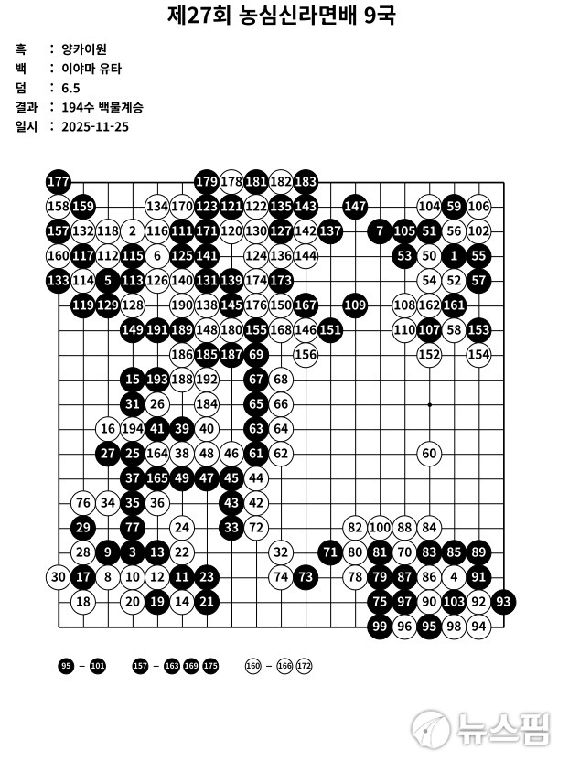 25일 부산 동래구 농심호텔에서 열린 본선 9국에서 이야마 유타 9단은 백으로 194수 만에 양카이원 9단에게 불계승을 거뒀다.