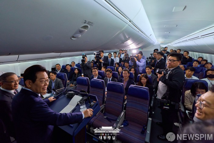 [서울=뉴스핌] 이재명 대통령이 지난 23일(현지시간) 튀르키예 앙카라로 향하는 공군 1호기에서 기내 기자간담회를 열고 있다. [사진=대통령실] 2025.11.26 photo@newspim.com