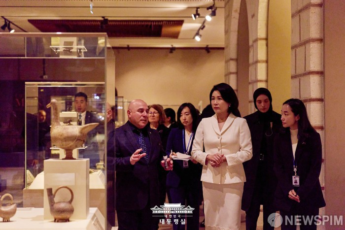 [서울=뉴스핌] 김혜경 여사가 지난 24일(현지시간) 튀르키예 앙카라에 위치한 아나톨리아 문명박물관을 방문하고 있다. [사진=대통령실] 2025.11.26 photo@newspim.com