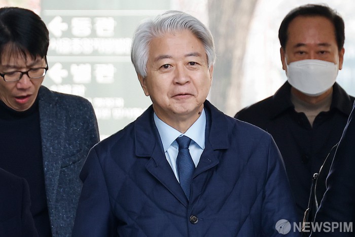 [서울=뉴스핌] 류기찬 기자 = 불법 정치자금 혐의를 받는 노웅래 전 더불어민주당 의원이 26일 오전 서울 서초구 서울중앙지법에서 열린 1심 선고 공판에 출석하고 있다. 2025.11.26 ryuchan0925@newspim.com
