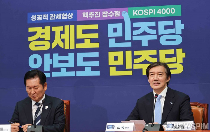 [서울=뉴스핌] 윤창빈 기자 = 조국 조국혁신당 대표가 26일 서울 여의도 국회에서 정청래 더불어민주당 대표를 예방한 가운데 발언하고 있다. 2025.11.26 pangbin@newspim.com