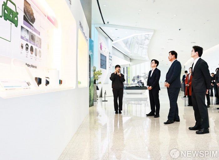 [서울=뉴스핌] 김정관 산업통상부 장관이 26일 전남 여수시 여수산업단지에 소재한 LG화학 산업현장을 방문해 관계자의 설명을 듣고 있다. [사진=산업통상부] 2025.11.26 photo@newspim.com