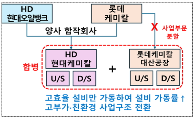 이번에 승인된 사업재편계획에 따르면, 롯데케미칼이 대산공장 사업을 분할한 후 HD현대케미칼(HD현대오일뱅크·롯데케미칼 합작회사)과 합병해 석유화학산업의 구조적 과잉문제로 지적되어 온 NCC 설비와 범용 석유화학 제품 설비 일부를 합리적으로 조정할 방침이다.