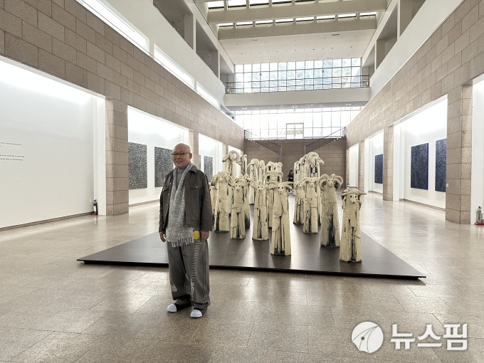 | [과천=뉴스핌] 이지은 기자 = '아프리카의 꿈' 연작 중 하나인 '아프리카의 꿈-토템' 앞에서 기념사진을 촬영하고 있는 신상호 작가. 2025.11.26 alice09@newspim.com |