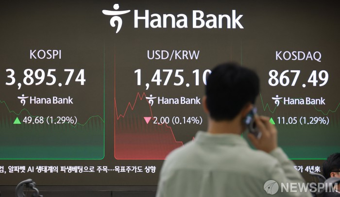 | [서울=뉴스핌] 김학선 기자 = 코스피가 장중 3900선 부근에서 움직이고 있는 25일 오전 서울 중구 하나은행 딜링룸 전광판에 코스피 지수가 표시돼 있다. 2025.011.25 yooksa@newspim.com |