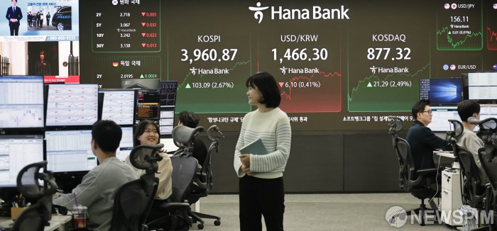 [서울=뉴스핌] 양윤모 기자 = 26일 오후 코스피가 전장 종가보다 103.09 포인트(2.67%) 상승하며 3960.87로, 코스닥은 21.29 포인트(2.49%) 상승한 877.32로 장을 마감한 가운데, 서울 중구 하나은행 딜링룸에서 직원들이 업무를 보고 있다. 서울외환시장에서 달러/원 환율은 전장 대비 6.10원 하락한 1466.30원에 주간거래를 마감했다. 2025.11.26 yym58@newspim.com