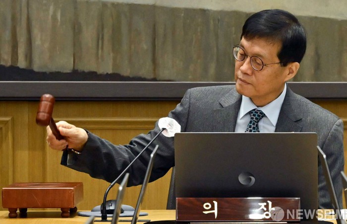 [서울=뉴스핌] 양윤모 기자 = 이창용 한국은행 총재가 27일 오전 서울 중구 한국은행 본관에서 열린 올해 마지막 금융통화위원회 본회의에서 회의를 알리는 의사봉을 두드리고 있다. 한은 금통위는 회의에서 기준금리를 4연속 연 2.50%로 동결했다. [공동취재] 2025.11.27 yym58@newspim.com