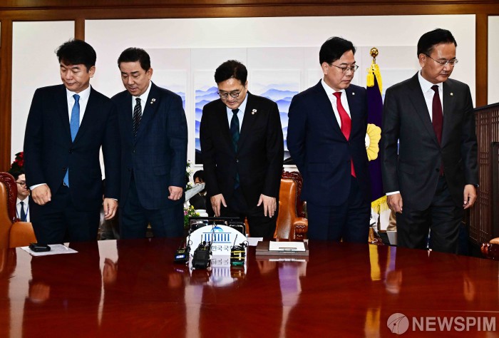 [서울=뉴스핌] 윤창빈 기자 = 우원식 국회의장을 비롯한 여야 원내대표가 27일 서울 여의도 국회에서 우 의장 주재로 열린 원내대표 회동에서 기념촬영을 하고 있다. 왼쪽부터 문진석 더불어민주당 원내수석부대표, 김병기 더불어민주당 원내대표, 우 의장, 송언석 국민의힘 원내대표, 유상범 국민의힘 원내운영수석부대표. 2025.11.27 pangbin@newspim.com