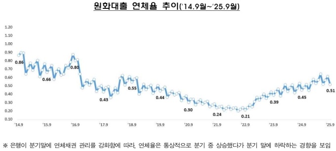 금융감독원은 9월말 국내은행의 원화대출 연체율(1개월이상 원리금 연체기준)은 0.51%로 전월말 0.61% 대비 0.10%포인트(p) 하락했다고 28일 밝혔다.
