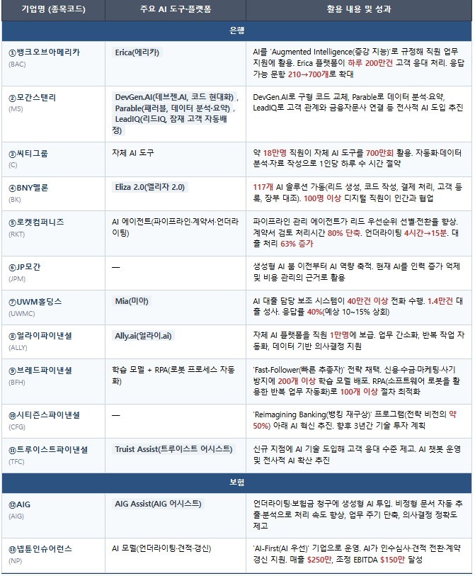 기관투자자용 금융 서비스와 추심 업무에도 AI를 투입하고, AI 플랫폼과 가상 비서로 일상 업무를 자동화하는 동시에 고객 상담 역량을 높이려 한다. 다수 금융사는 AI를 인력 대체가 아닌 역량 보완 수단으로 보고 비용 절감과 직원 업무 지원을 병행하고 있다.