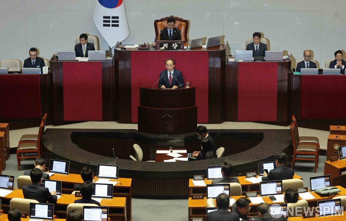 [서울=뉴스핌] 윤창빈 기자 = 추경호 국민의힘 의원이 27일 서울 여의도 국회에서 열린 본회의에서 본인의 체포동의안에 대한 신상발언을 하고 있다. 2025.11.27 pangbin@newspim.com