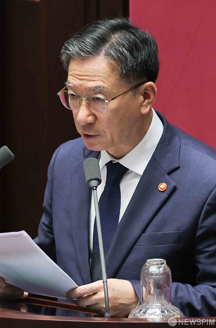 [서울=뉴스핌] 윤창빈 기자 = 정성호 법무부 장관이 27일 서울 여의도 국회에서 열린 본회의에서 추경호 국민의힘 의원의 체포동의안에 대한 제안설명을 하고 있다. 2025.11.27 pangbin@newspim.com