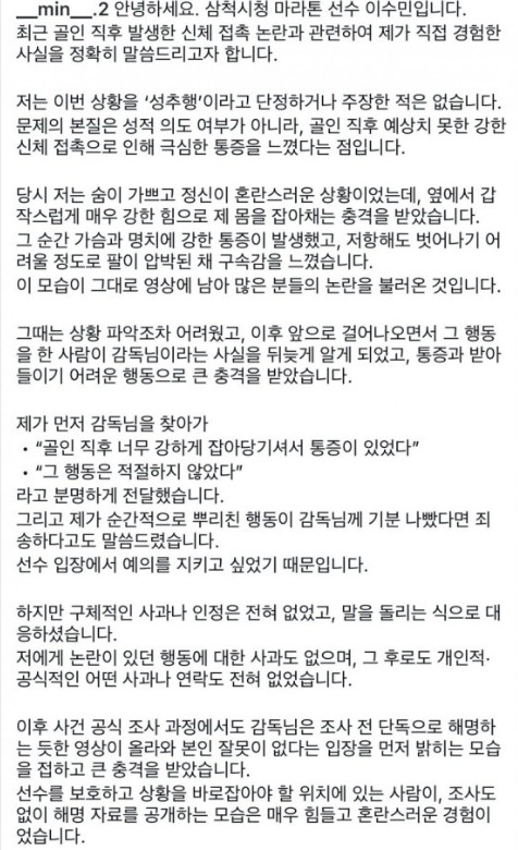 | [서울=뉴스핌] 장환수 스포츠전문기자= 이수민이 25일 자신의 인스타그램에 올린 입장문. [사진=이수민] 2025.11.27 zangpabo@newspim.com |