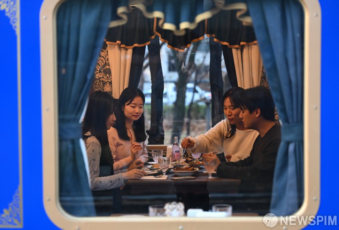 [서울=뉴스핌] 양윤모 기자 = 늦가을의 추억이 무르익는 27일 서울 노원구 공릉동 화랑대철도공원 내 오픈 준비중인 유럽풍 특급열차 레스토랑 '익스프레스 노원 by 미라쥬'에서 시식 평가단이 개장 전 메뉴를 시식하고 있다. '익스프레스 노원 by 미라쥬' 1량은 영화 세트 전문가가 특수 제작하고 1량은 무궁화호 객차를 리모델링해 주방 및 운영 공간으로 구성했다. 내부는 정교한 문양과 샹들리에, 유럽풍 소품으로 꾸며져 특급열차의 화려한 감성을 그대로 담아냈다. 레스토랑에서는 '태릉솔밭 갈비 파스타', '불암산 리조또' 등 노원만의 특색을 담은 메뉴를 선보일 예정이며, 지역 상권 활성화와 지역 명소화를 위해 로컬 브랜드 사업자와의 협업을 통해 운영한다. 레스토랑은 12월 2일부터 정식 운영되며, 매주 월요일을 제외한 화요일부터 일요일까지 오전 11시부터 오후 9시까지 운영된다. 설·추석 명절 당일 휴무 외에는 공휴일에도 정상 운영될 예정이다. [사진=노원구청] 2025.11.27 yym58@newspim.com