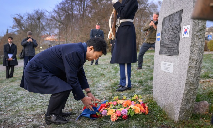 | 안규백 장관이 27일 스웨덴 스톡홀름에 위치한 6·25전쟁 참전기념비에 참배하고 헌화하고 있다. [사진=국방부 제공] 2025.11.27 gomsi@newspim.com |