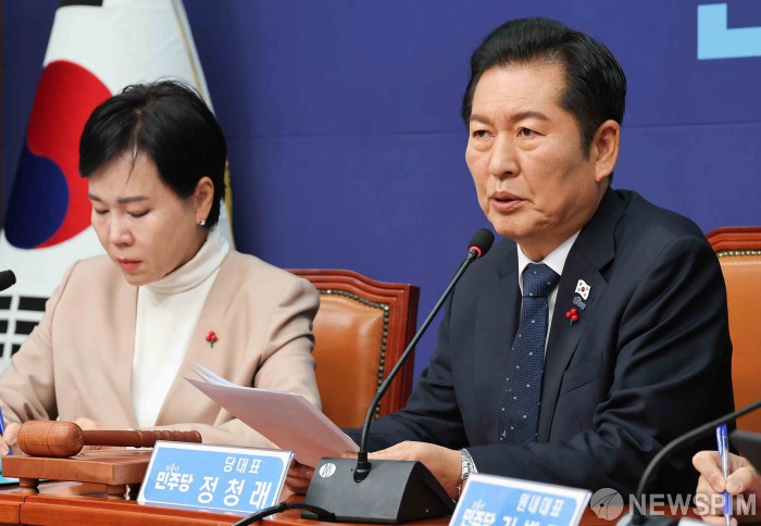 [서울=뉴스핌] 윤창빈 기자 = 정청래 더불어민주당 대표가 28일 서울 여의도 국회에서 열린 최고위원회의에서 모두발언을 하고 있다. 2025.11.28 pangbin@newspim.com