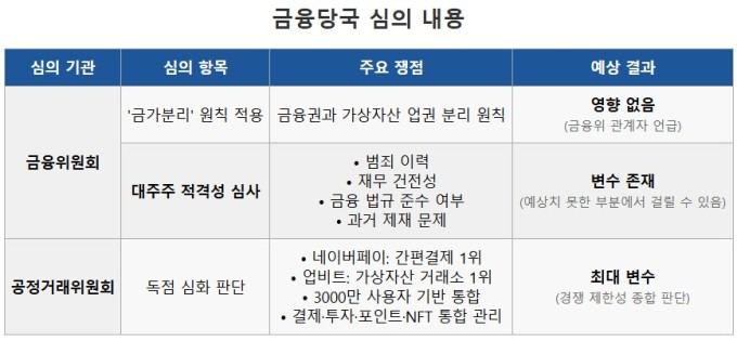 이번 합병은 역대 최초의 빅테크기업과 가상자산 업체 간 결합으로, 금융당국과 공정거래위원회가 어떤 결정을 할지가 막판 변수가 될 전망이다. 기존 금융·가상자산 규제 원칙과 독점 규제 등 당국의 원칙이 시험받게 됐다.