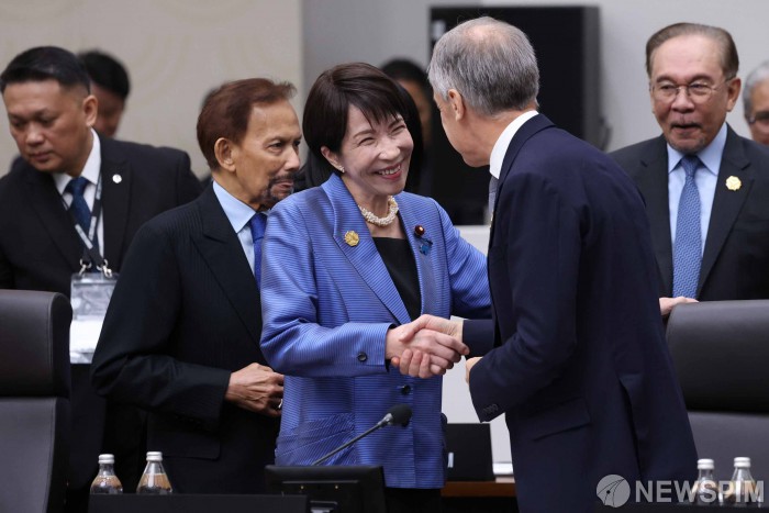 [서울=뉴스핌] 다카이치 사나에 일본 총리가 1일 경주화백컨벤션센터(HICO)에서 열린 2025 아시아태평양경제협력체(APEC) 정상회의 제2세션에 참석하고 있다. [사진=APEC 2025 KOREA & 연합뉴스] 2025.11.01 photo@newspim.com