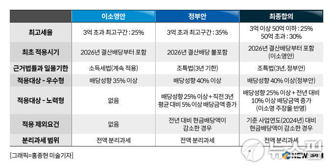 여야가 합의한 배당소득 분리과세안은 2000만원 초과~3억원 이하 20%, 3억원 초과~50억원 이하 25%, 50억원 초과 30% 별도 세율 적용이다.