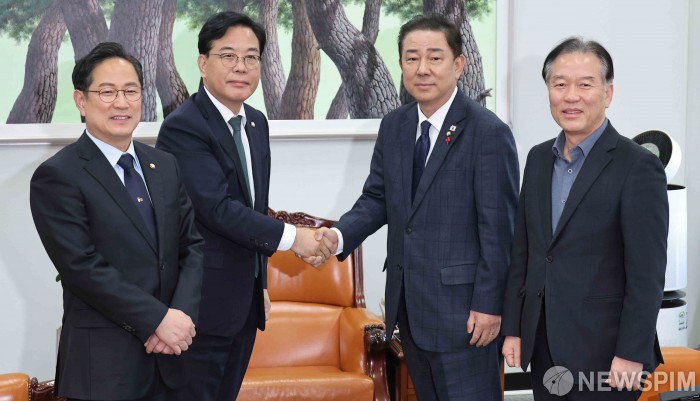 [서울=뉴스핌] 윤창빈 기자 = 김병기 더불어민주당 원내대표, 송언석 국민의힘 원내대표가 28일 서울 여의도 국회에서 열린 여야 2+2 회동에서 악수를 하고 있다. 왼쪽부터 박수영 국회 기획재정위원회 국민의힘 간사, 송 원내대표, 김 원내대표, 정태호 국회 기획재정위원회 더불어민주당 간사. 2025.11.28 pangbin@newspim.com