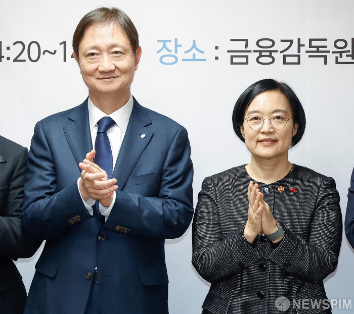 [서울=뉴스핌] 류기찬 기자 = 한성숙 중소벤처기업부 장관(오른쪽), 이찬진 금융감독원장이 28일 오후 서울 영등포구 금융감독원에서 열린 '모험자본 생태계와 상생금융 활성화를 위한 중소벤처기업부-금융감독원 업무협약식'에서 기념촬영을 하고 있다. 2025.11.28 ryuchan0925@newspim.com