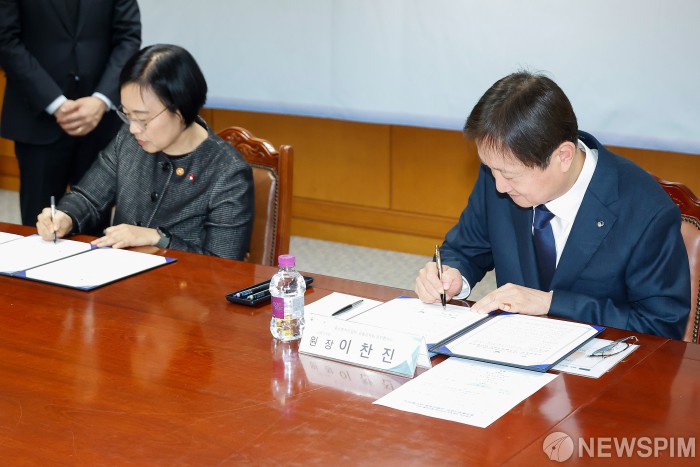 [서울=뉴스핌] 류기찬 기자 = 한성숙 중소벤처기업부 장관(왼쪽)과 이찬진 금융감독원장이 28일 오후 서울 영등포구 금융감독원에서 열린 '모험자본 생태계와 상생금융 활성화를 위한 중소벤처기업부-금융감독원 업무협약식'에서 협약서에서 서명을 하고 있다. 2025.11.28 ryuchan0925@newspim.com