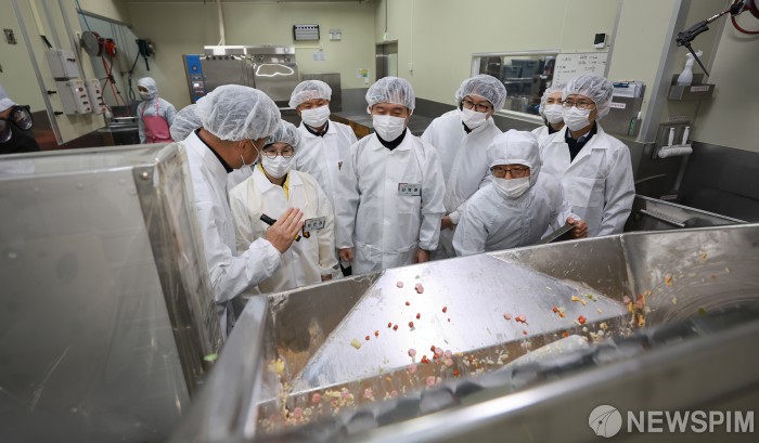 [서울=뉴스핌] 김영훈 고용노동부 장관과 원민경 성평등가족부 장관이 28일 인천 남동구 식료품 제조공장에서 안전수칙 위반 여부 등을 점검하고 있다. [사진=고용노동부] 2025.11.28 photo@newspim.com