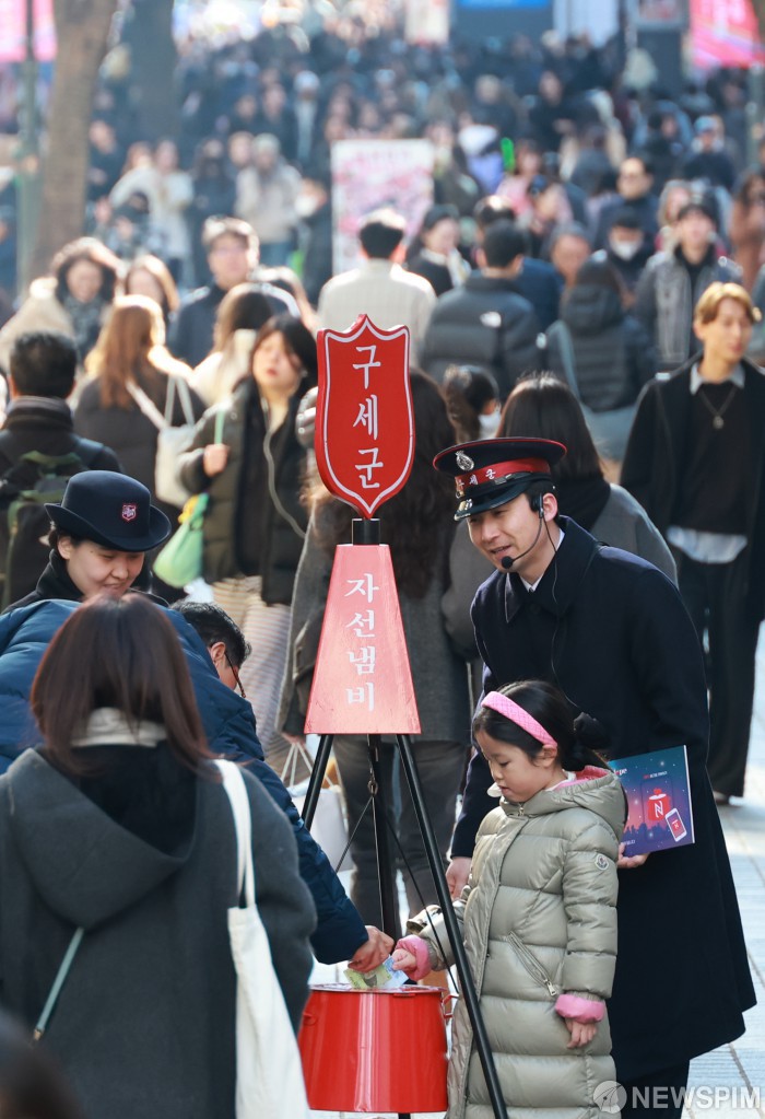 [서울=뉴스핌] 김학선 기자 = 2025 구세군 연말 모금 캠페인이 시작된 28일 서울 중구 명동거리에서 한 어린이가 자선냄비에 성금을 기부하고 있다. 올해로 97번째를 맞는 구세군 연말 자선냄비 모금 캠페인은 'Light of Hope'(희망의 빛)을 주제로 전국 300여 곳에서 진행된다. 2025.11.28 yooksa@newspim.com