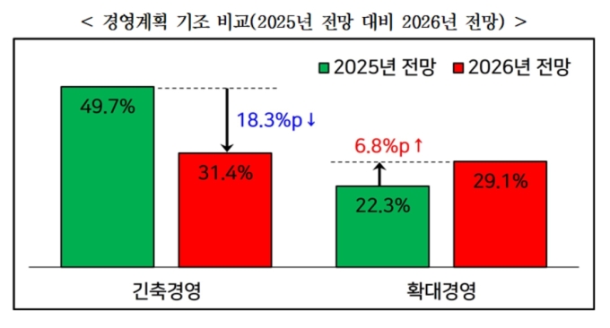 2026년 경영계획 수립기업의 기조는 전년 조사(2025년 경영전망)에 비해 긴축경영이 줄고(49.7%→31.4%), 확대경영이 늘어난(22.3%→ 29.1%) 것으로 나타났다.