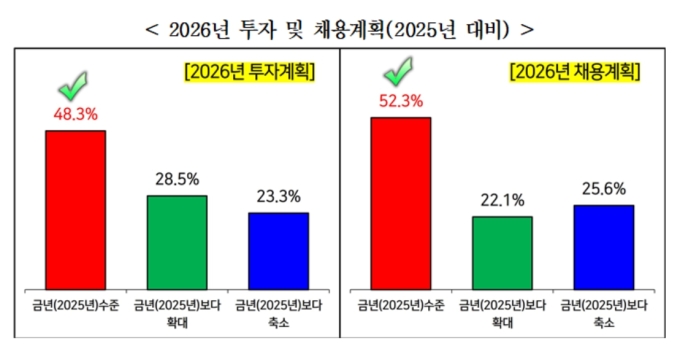 경영계획 수립 기업은 투자와 채용계획 모두 '금년(2025년) 수준' 응답이 가장 많았다.