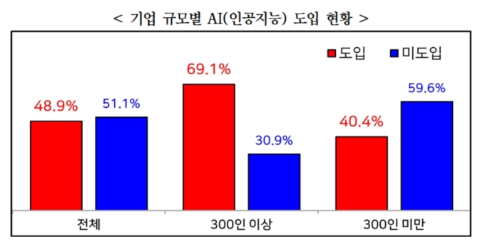 회사 차원에서 'AI를 도입했다'는 응답은 300인 이상 기업(69.1%)이 300인 미만 기업(40.4%)보다 28.7%p 높게 나타났다.