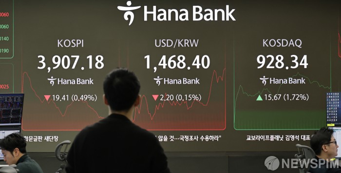 [서울=뉴스핌] 양윤모 기자 = 1일 오전 코스피가 전장 종가보다 19.41 포인트(0.49%) 하락하며 3907.18로, 코스닥은15.67 포인트(1.72%) 상승한 928.34로 장을 시작한 가운데, 서울 중구 하나은행 딜링룸에서 직원들이 업무를 보고 있다. 서울외환시장에서 달러/원 환율은 전장 대비 2.20원 하락한 1468.40원에 주간거래를 시작했다. 2025.12.01 yym58@newspim.com